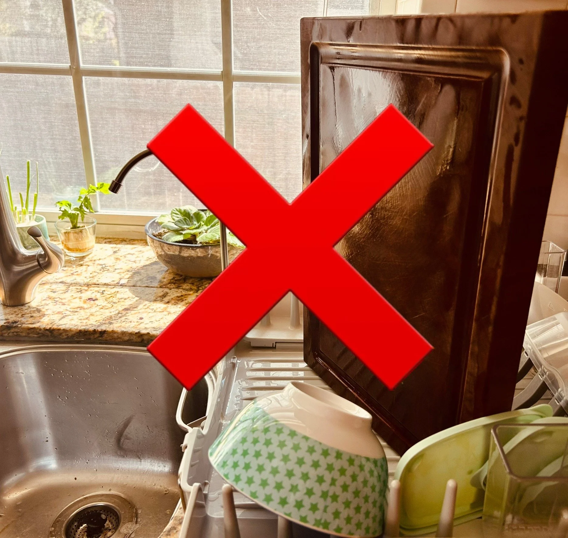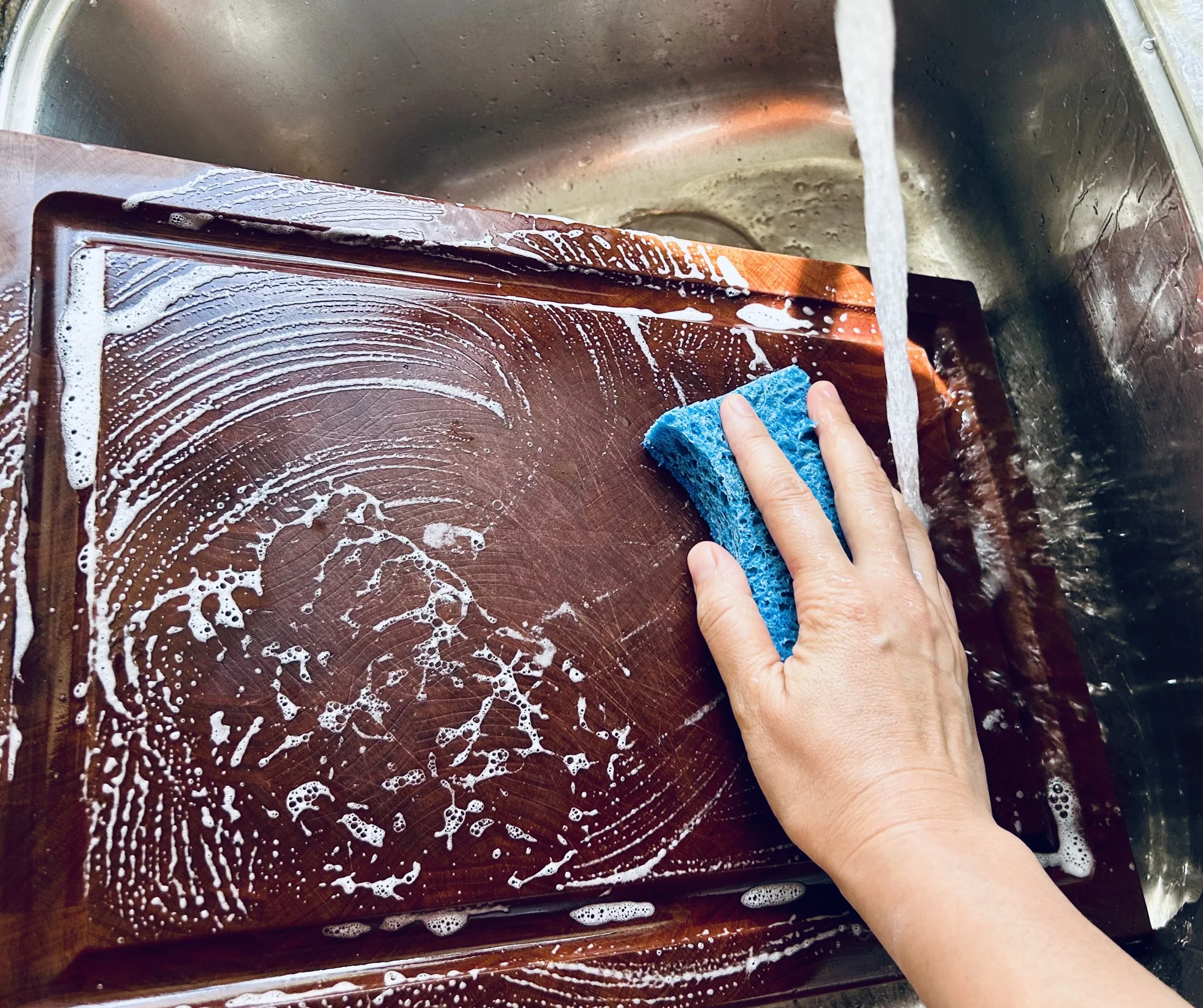 Wash by hand with warm water and plain dish soap on a regular nonabrasive sponge after use, and always dry thoroughly afterwards. Never put wood in the dishwasher and never let it drip dry. You’ve got a soft kitchen towel on hand for a reason, right?